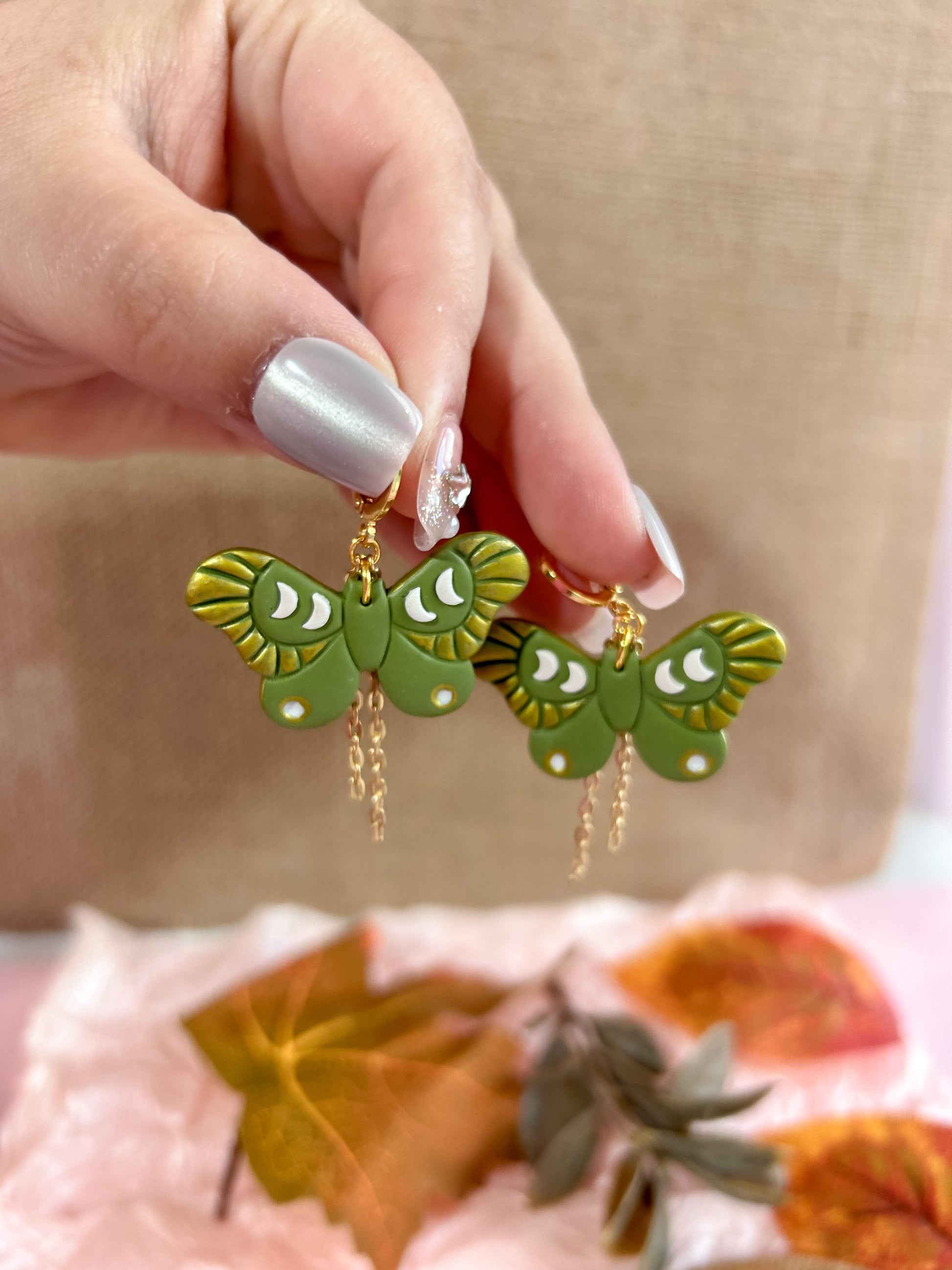 A delicate pair that captures the magic of autumn in every flutter. With soft green tones and golden accents, these butterflies feel like a warm breeze on a cozy fall afternoon.